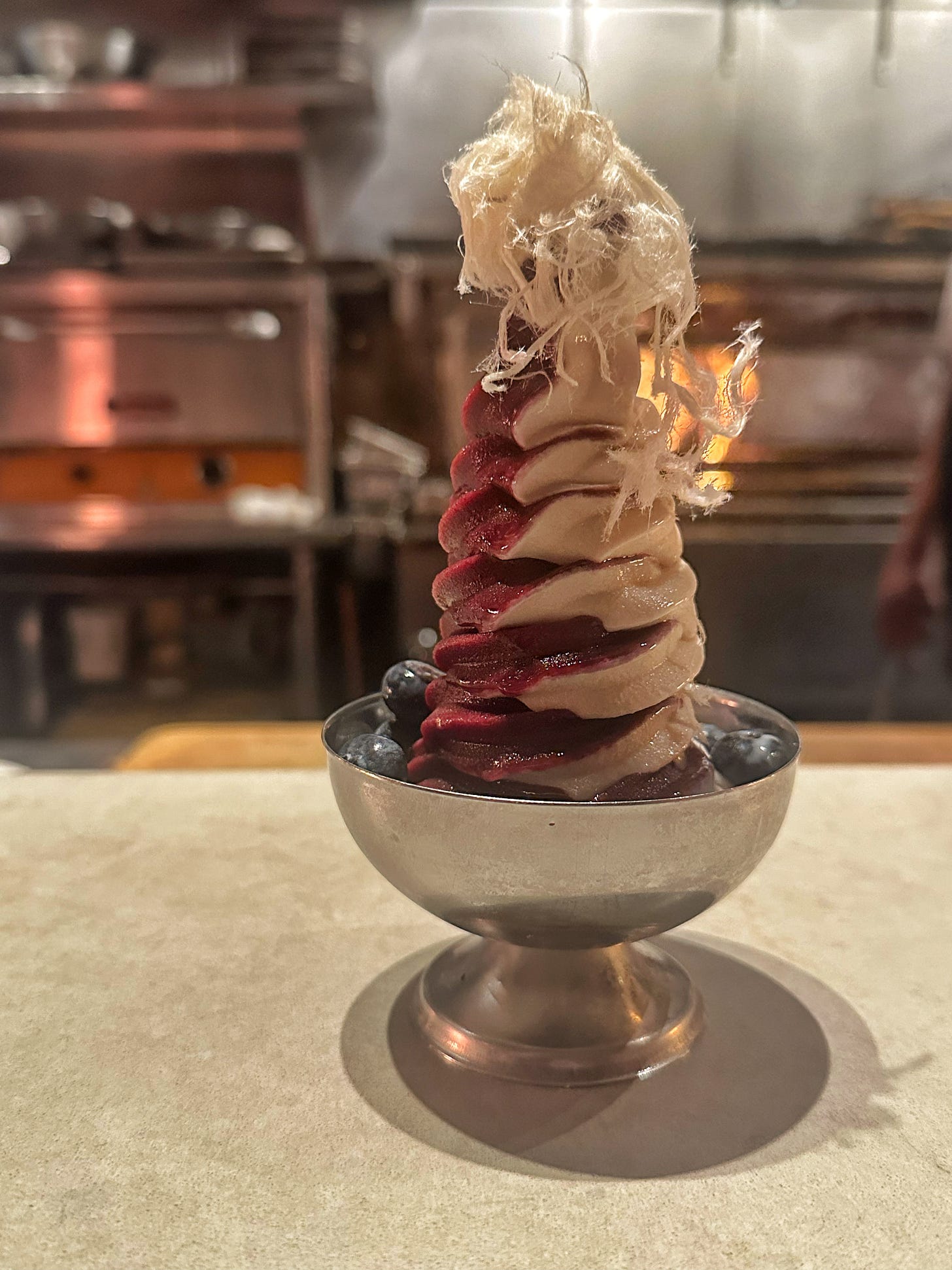I have an upcoming dispatch in the works about my recent debut dinner at Shukette, the much-buzzed and always packed Middle Eastern restaurant in Chelsea, but this dessert is worth talking about twice, I promise. Among the selection of soft-serve closers on the dessert menu is “The Swirl,” a towering, layered combination of tahini and blueberry soft-serve ice cream in a moat of fresh blueberries and a ginger cookie crumble (I asked to also add the “halva floss”—more on that next time). It was thick and rich and nutty and tangy and there was nothing left to show because we ate every bit of it.