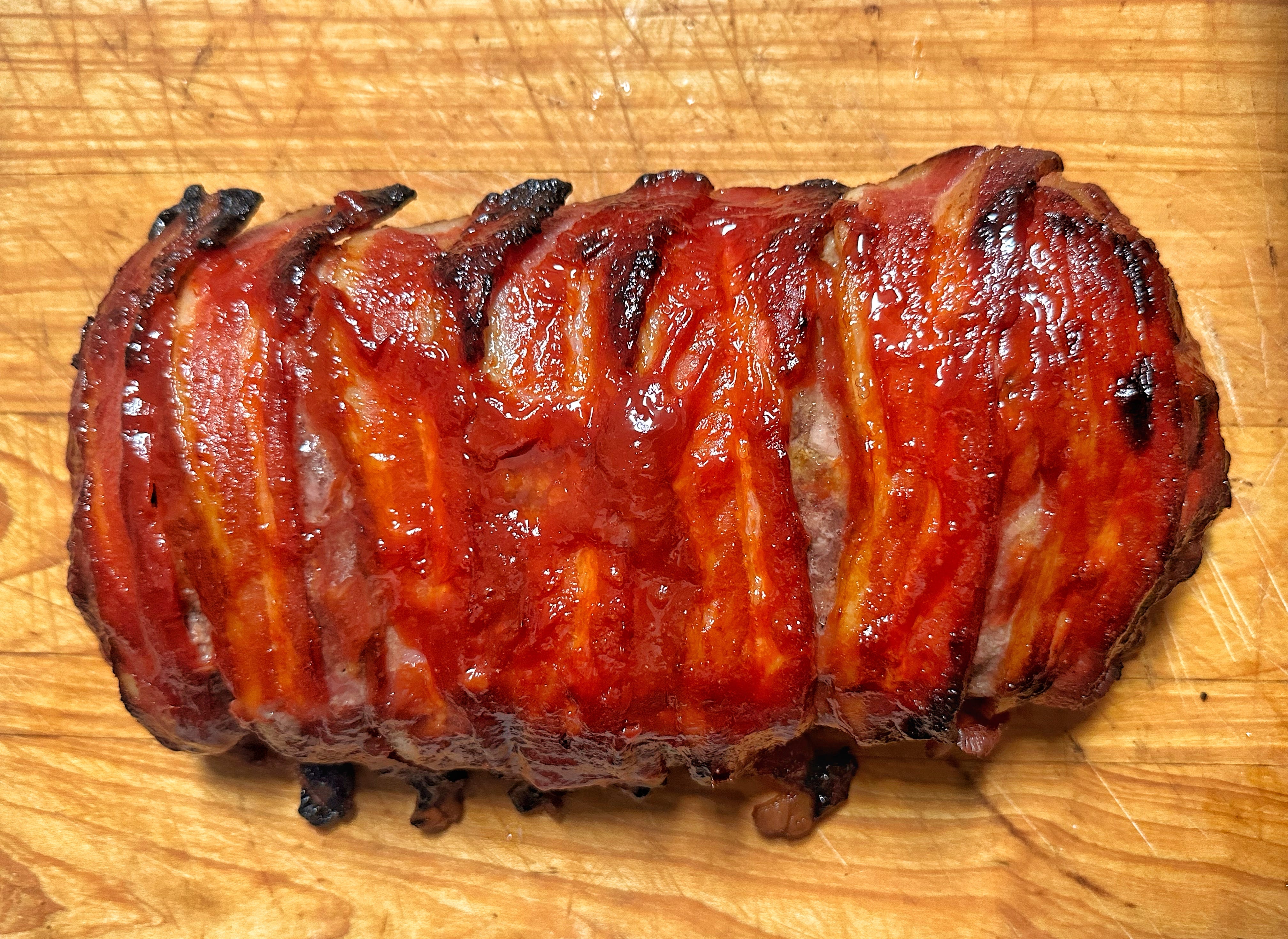When Ed rolled in from the airport after a cross-country flight a couple Sundays ago, I had prepared a bacon-larded Meat Loaf with spicy ketchup and brown sugar glaze, rustic Yukon Gold mashed potatoes, and roasted Brussels sprouts finished in glaze of honey, red wine vinegar, and red pepper.