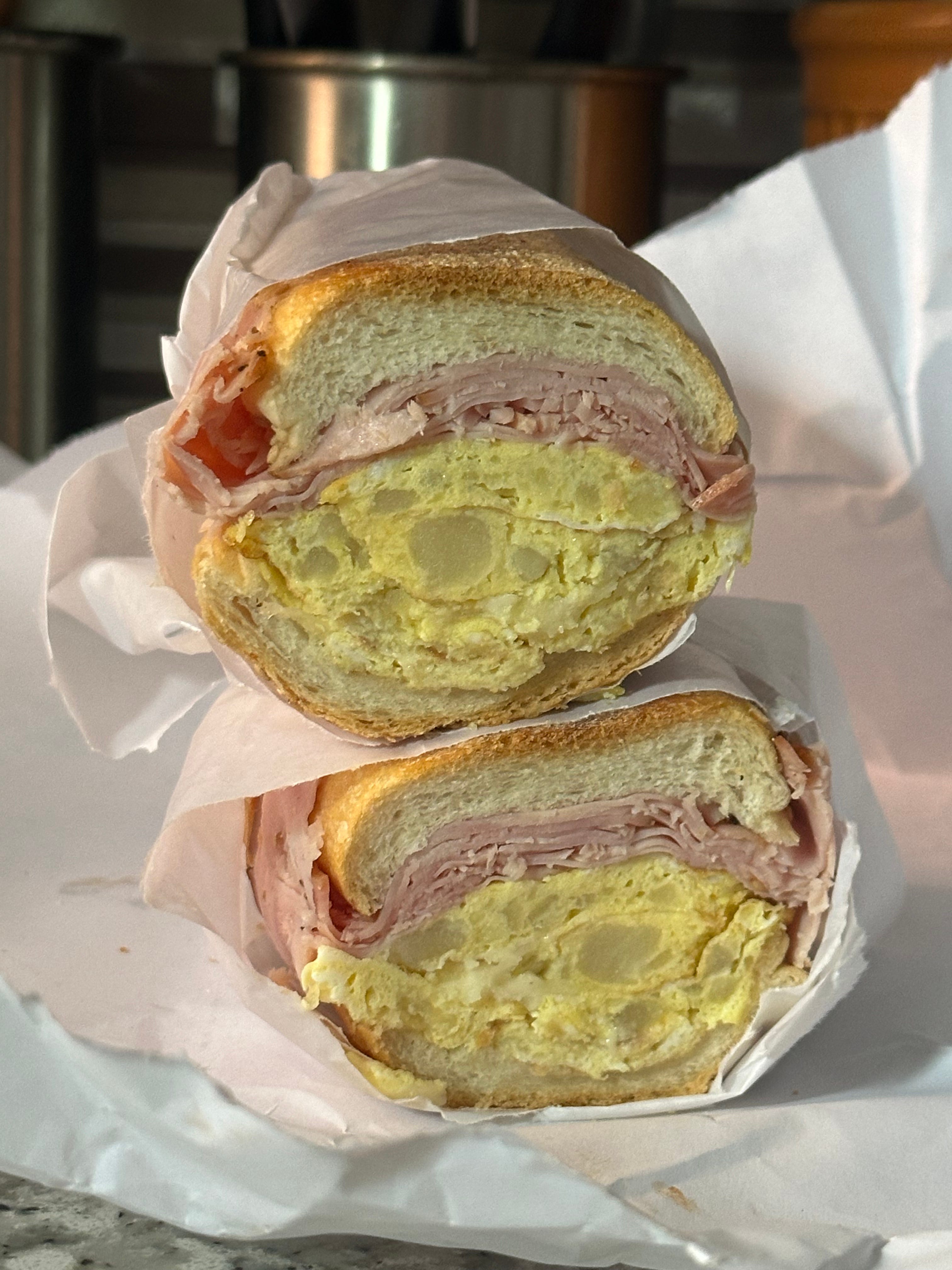 This cross-section of this mighty Potato, Egg & Cheese sandwich tells you why the 102-year-old Red Hook institution Defonte’s was a favorite of longshoremen working the nearby Brooklyn waterfront back in the day. And this is a small! I added Virginia baked ham as that’s the pro move and plenty of black pepper. I brought it back home on a Saturday afternoon and ate half for lunch while watching college football then woke up in a daze hours later on the sofa. This is the kind of sandwich that will do that to you.