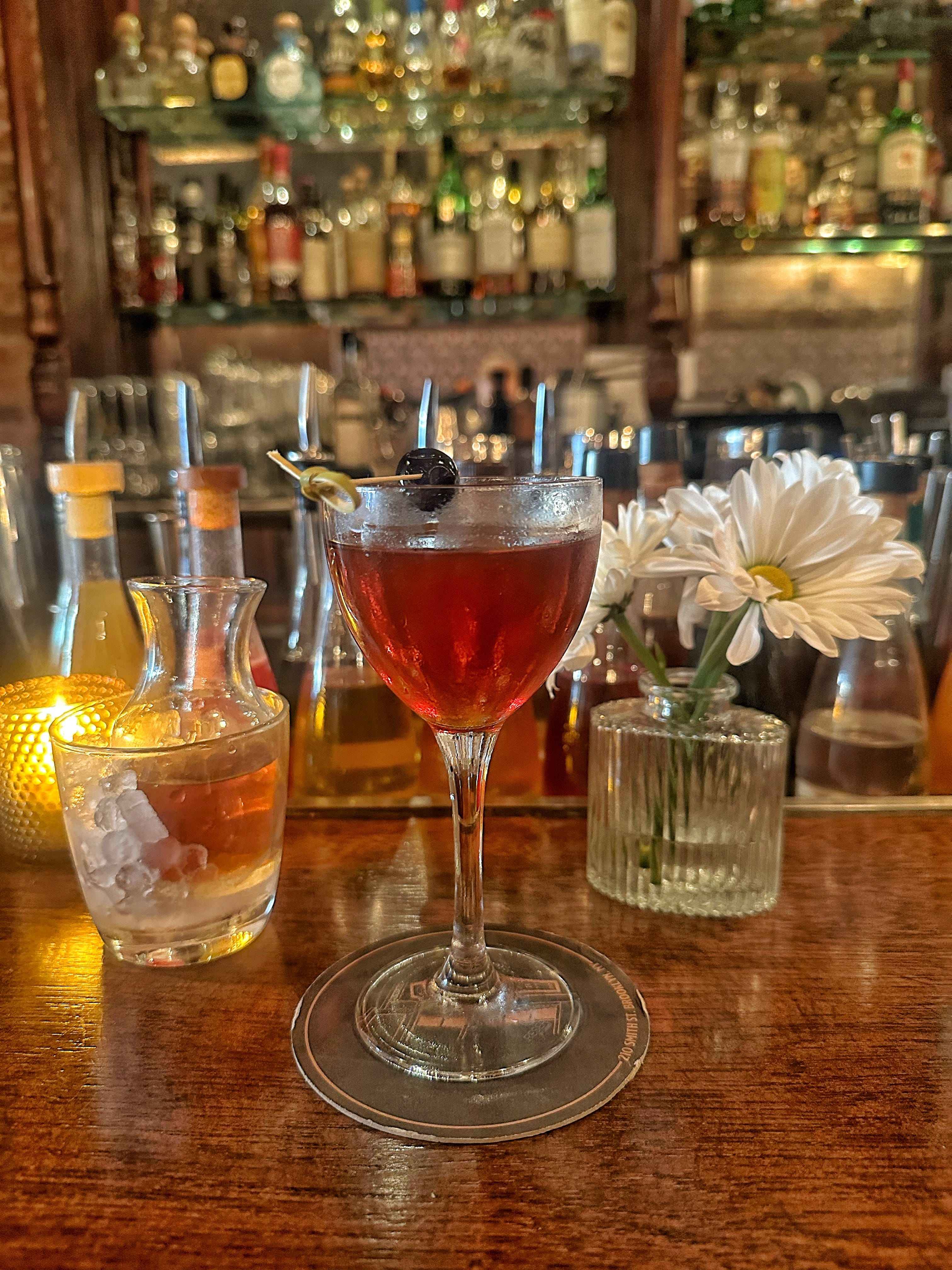 I ordered owner Julie Reiner’s 2009 modern classic, The Slope, a Manhattan variation composed of rye whiskey, Punt e Mes, apricot liqueur, and Angostura bitters. It’s a favorite of mine and the spirit-forward cocktail makes its presence known upon the first sip and its served with a sidecar decanter nestled in glass filled with crushed ice.